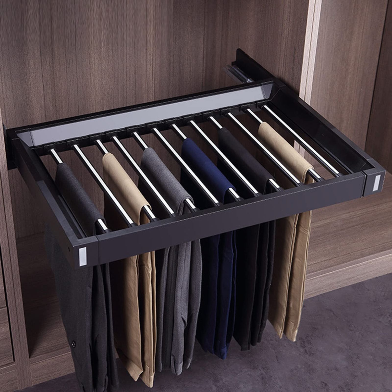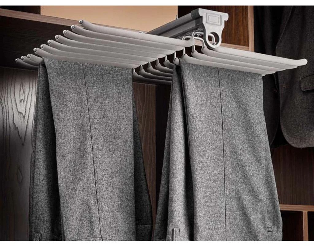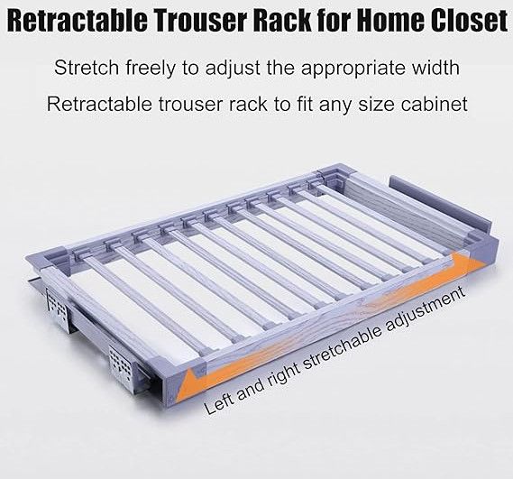Upgrade your wardrobe organization with our premium pull-out pants rack—your ultimate solution for maximizing closet space and keeping trousers wrinkle-free and easily accessible. Featuring smooth-glide, separate hanging bars, this innovative rack can store multiple pairs of pants in a neat, orderly manner, minimizing clutter and saving valuable shelf space. Designed for modern closets, it fits seamlessly into any standard wardrobe and is crafted from durable materials to ensure long-lasting use. Available in sleek black and classic silver finishes, and in sizes to accommodate both small and large closets. Effortless installation makes this a must-have for anyone seeking style and practicality in their closet space.